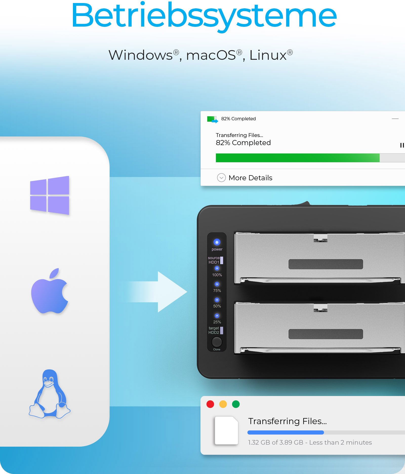 Klonen, Lesen, Verbinden: Ihre All-in-One Speicherlösung. Die IB-1233CL-CR ist weit mehr als nur eine herkömmliche DockingStation. Sie kombiniert leistungsstarkes Standalone-Klonen mit einem integrierten Kartenleser und USB-Hub – perfekt für Profis, Kreative und alle, die effizient mit Daten arbeiten. Zwei Einschübe ermöglichen die Nutzung von 2,5"- und 3,5"-SATA-HDDs und -SSDs. Klonen Sie Ihre Festplatte auf Knopfdruck – ganz ohne PC. Der integrierte LED-Fortschrittsbalken zeigt den Klonvorgang transparent in vier Schritten (25 %, 50 %, 75 %, 100 %) an und sorgt so für maximale Kontrolle und Sicherheit. Zusätzliche Vielseitigkeit bietet der integrierte Kartenleser für CF- und SD-Karten, der das Auslesen und Übertragen von Fotos und Videos direkt von der Speicherkarte erlaubt – ideal für Fotografen oder Content Creators. Dank USB 3.0-Anschluss können Sie weitere Geräte anschliessen und Ihren Workflow bequem erweitern. Die IB-1233CL-CR liefert schnelle Datenübertragungen, zuverlässigen Betrieb dank beiliegendem Netzadapter und ein durchdachtes Design für Ihren Arbeitsplatz. Ob Backup, Systemmigration oder Medienimport – mit dieser kompakten Lösung behalten Sie jederzeit die Kontrolle über Ihre Daten.