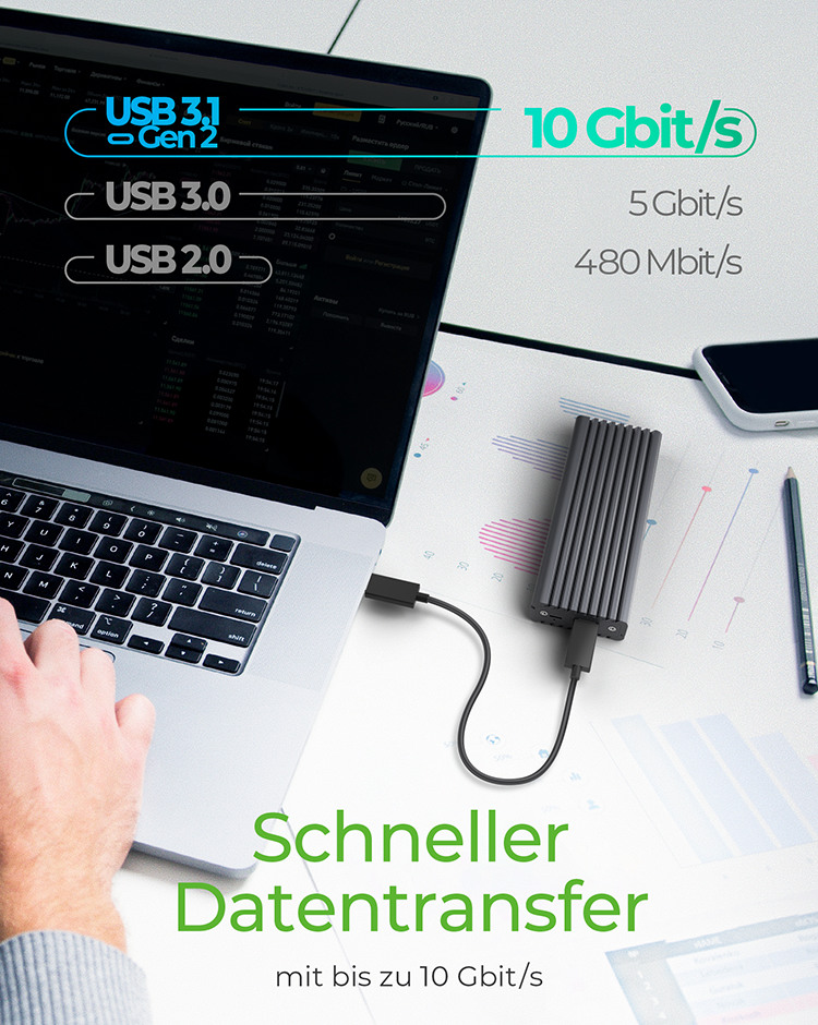 - Durch das USB Protokoll der Version 3.1 (Gen 2) wird mit 10 Gbit/s die doppelte Datengeschwindigkeit im Vergleich zur niedrigeren USB Version erreicht. Eine Besonderheit dieses externen Gehäuses ist die Kombination aus SATA und NVMe. Endlich können beide