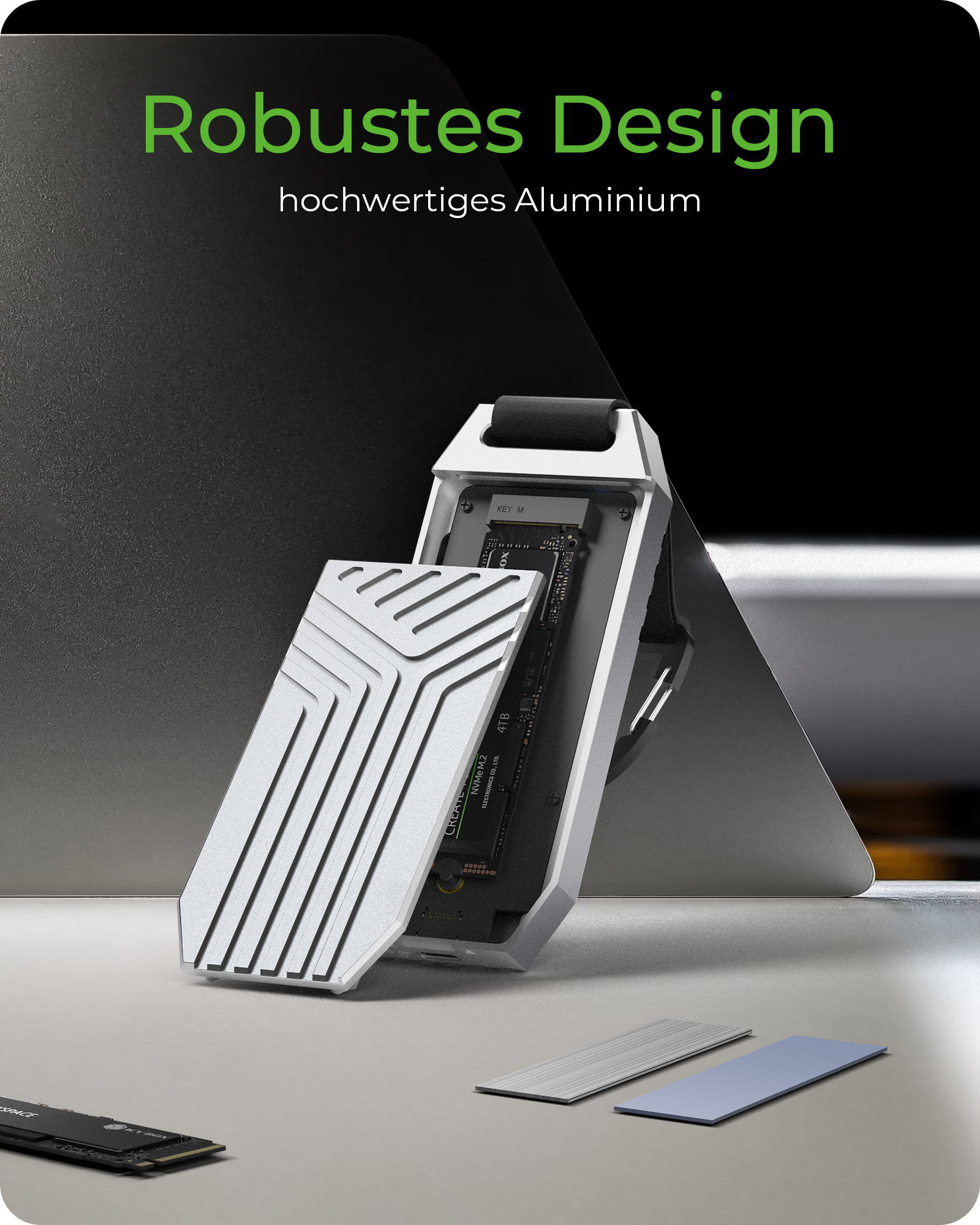 - Robustes Aluminiumgehäuse - Die hochwertige Aluminiumkonstruktion bietet ausgezeichnete Langlebigkeit und Schutz für Ihre SSD, während sie effektiv Wärme ableitet, um optimale Leistung während längerer Nutzung aufrechtzuerhalten.