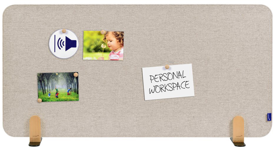Hochwertige, rahmenlose Tischtrennwand, doppelseitig als schallabsorbierendes Pinboard verwendbar