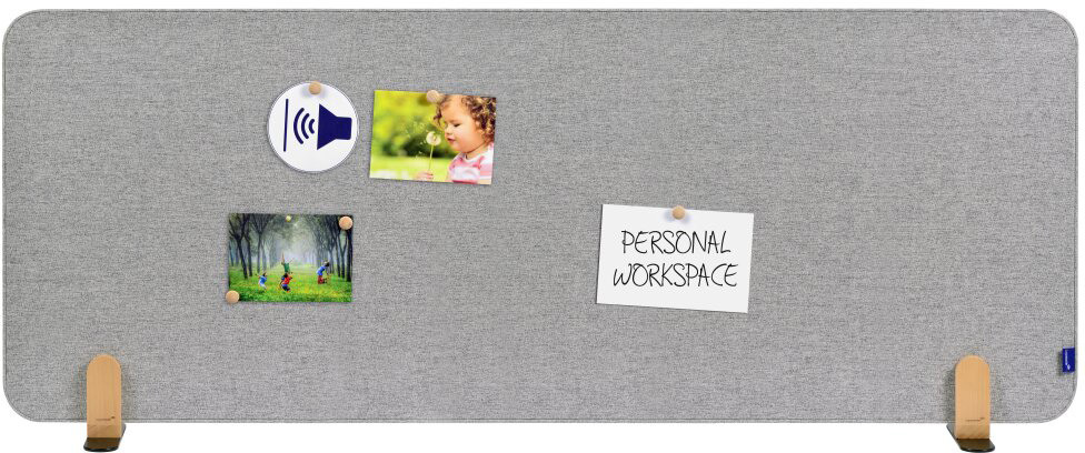 Hochwertige, rahmenlose Tischtrennwand, doppelseitig als schallabsorbierendes Pinboard verwendbar
