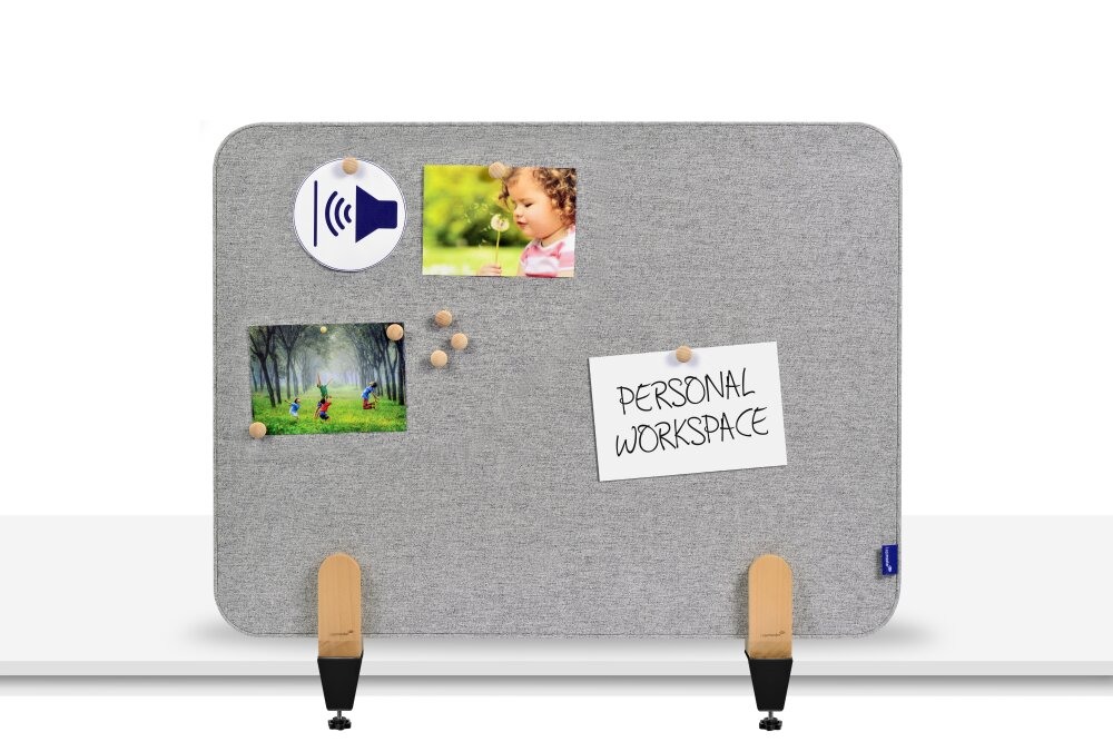 Die hochwertige, rahmenlose, doppelseitge Tischtrennwand, absorbiert hervoragend den Schall und verbessert die Akustik im Raum. Die Pinnbare Trennwand, hilft den Lärmpegel zu reduzieren und verbessert so Ihre Konzentration und Ihr Wohlbefinden.