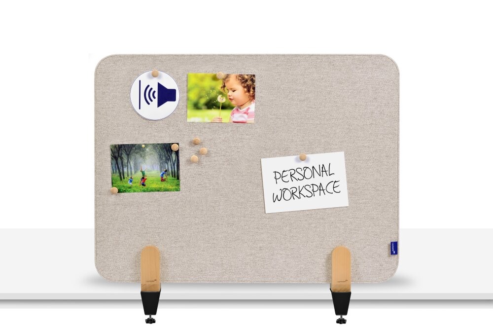 Hochwertige, rahmenlose Tischtrennwand, doppelseitig als schallabsorbierendes Pinboard verwendbar