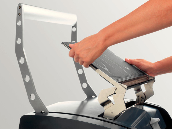 Der Ent-Binder öffnet die Metallklemmschiene, um Seiten aus dem Dokument zu entfernen oder einzufügen.