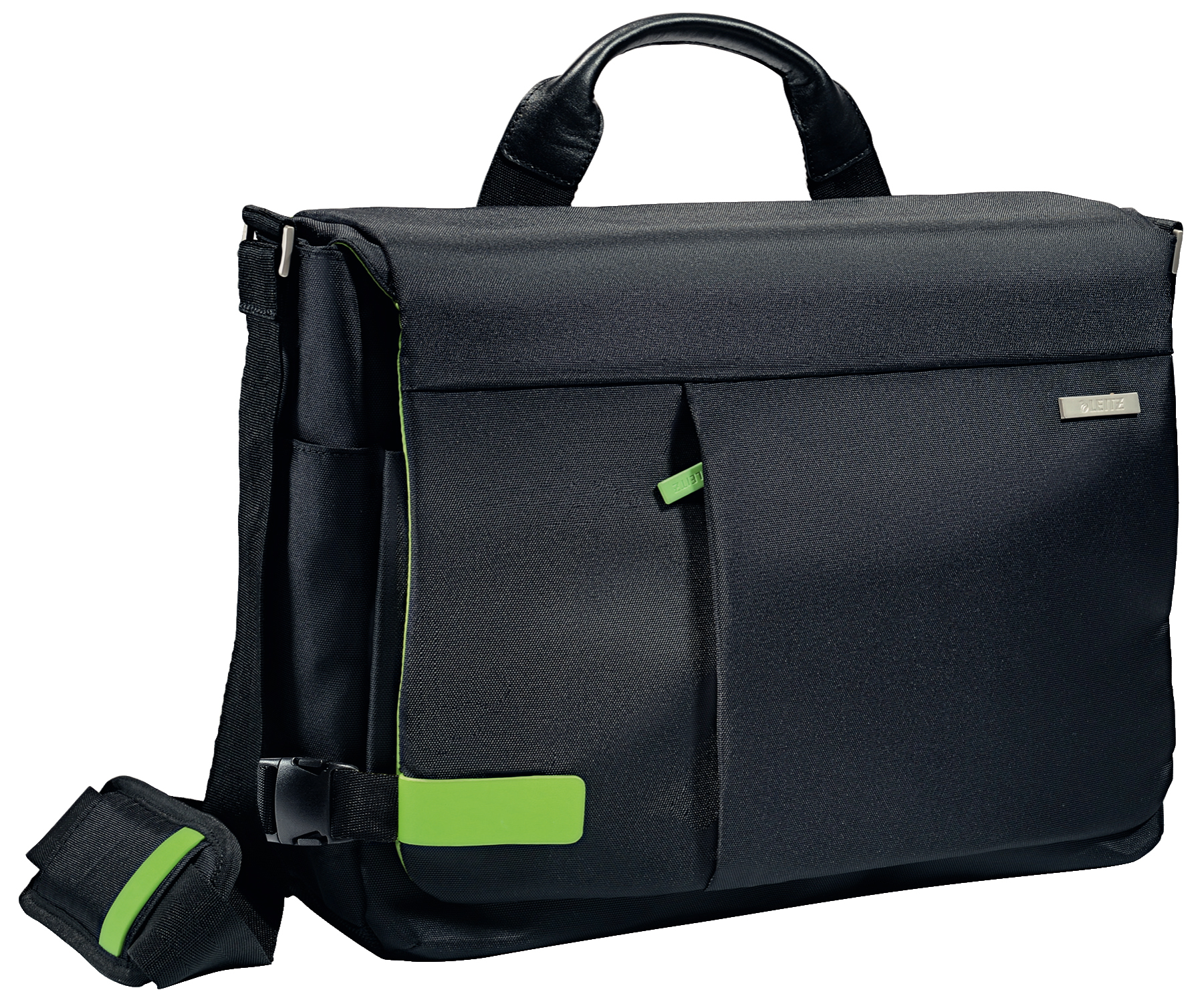Hochwertige und leichte Business Messenger-Tasche mit einem Hauptfach und einem kleineren Frontfach. Einzigartiges und elegantes Design mit leichtgängigen Reissverschlüssen und edlen Metallelementen. Lässt sich komfortabel am geschmeidigen Echtledergriff tragen, am verstellbaren Schultergurt oder fixiert am Trolley.
