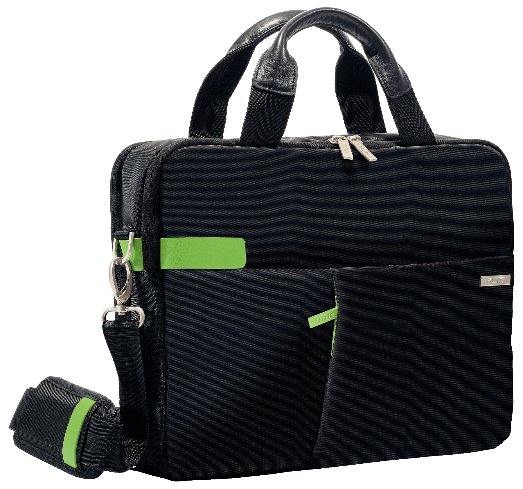 Hochwertige und leichte Business Tasche mit zwei Hauptfächern und einem kleineren Frontfach. Einzigartiges und elegantes Design mit leichtgängigen Reissverschlüssen und edlen Metallelementen. Lässt sich komfortabel an geschmeidigen Echtledergriffen tragen, am verstellbaren Schultergurt oder fixiert am Trolley.