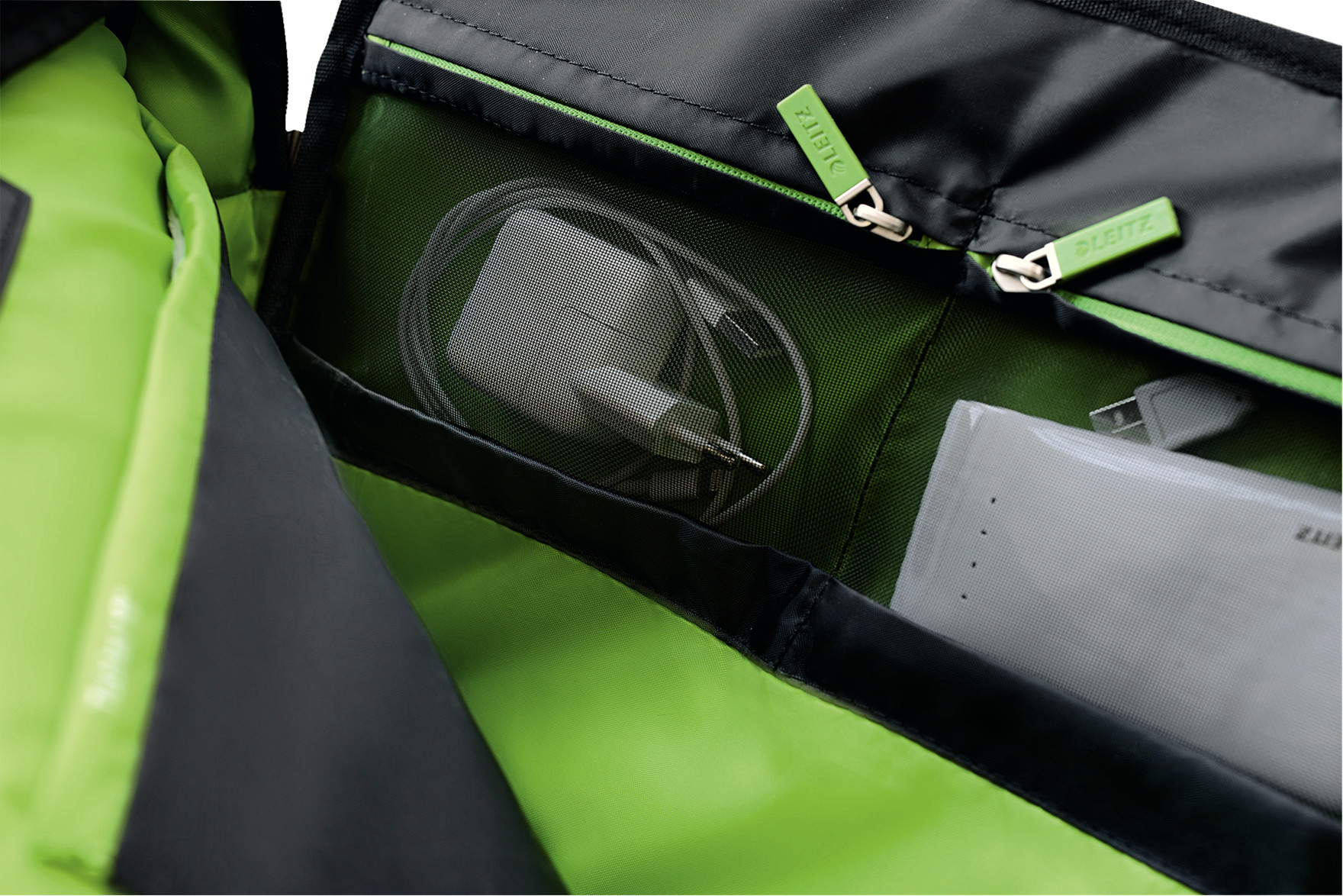 - Praktische Netzfächer ermöglichen Durchsicht auf Kabel und kleines Zubehör