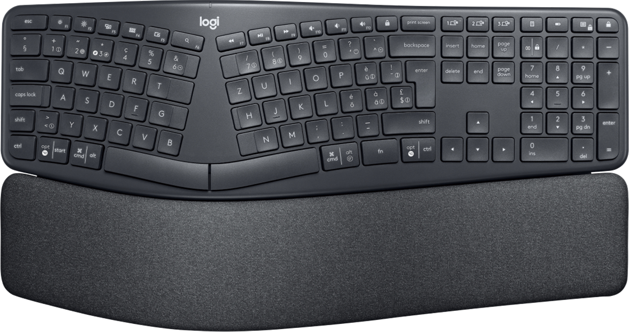 Die Ergo K860 von Logitech ist eine ergonomische Tastatur für eine gesunde und natürliche Haltung beim Tippen. Das fortschrittliche, ergonomische Design der Tastatur fördert eine entspannte Schreibhaltung, indem sie die Beugung des Handgelenks um 25% reduziert und 54% mehr Handgelenkstütze bietet. Das gebogene, geteilte Tastaturfeld reduziert die Muskelbelastung der Handgelenke und Unterarme, während die gepolsterte Handgelenkstütze Komfort und eine optimale ergonomische Position bietet. Dank einstellbarem Winkel der Handgelenkauflage ist die natürliche Haltung sowohl beim Sitzen, als auch beim Stehen gegeben. Der kurze Tastenhub fördert zudem das flüssige und präzise Schreiben auf der Tastatur. Die Tastatur lässt sich per Bluetooth und USB-Empfänger mit bis zu drei Endgeräten verbinden und kann bequem per Tastendruck zwischen diesen wechseln.Ergonomische, kabellose Tastatur via Bluetooth oder USB-Empfänger.