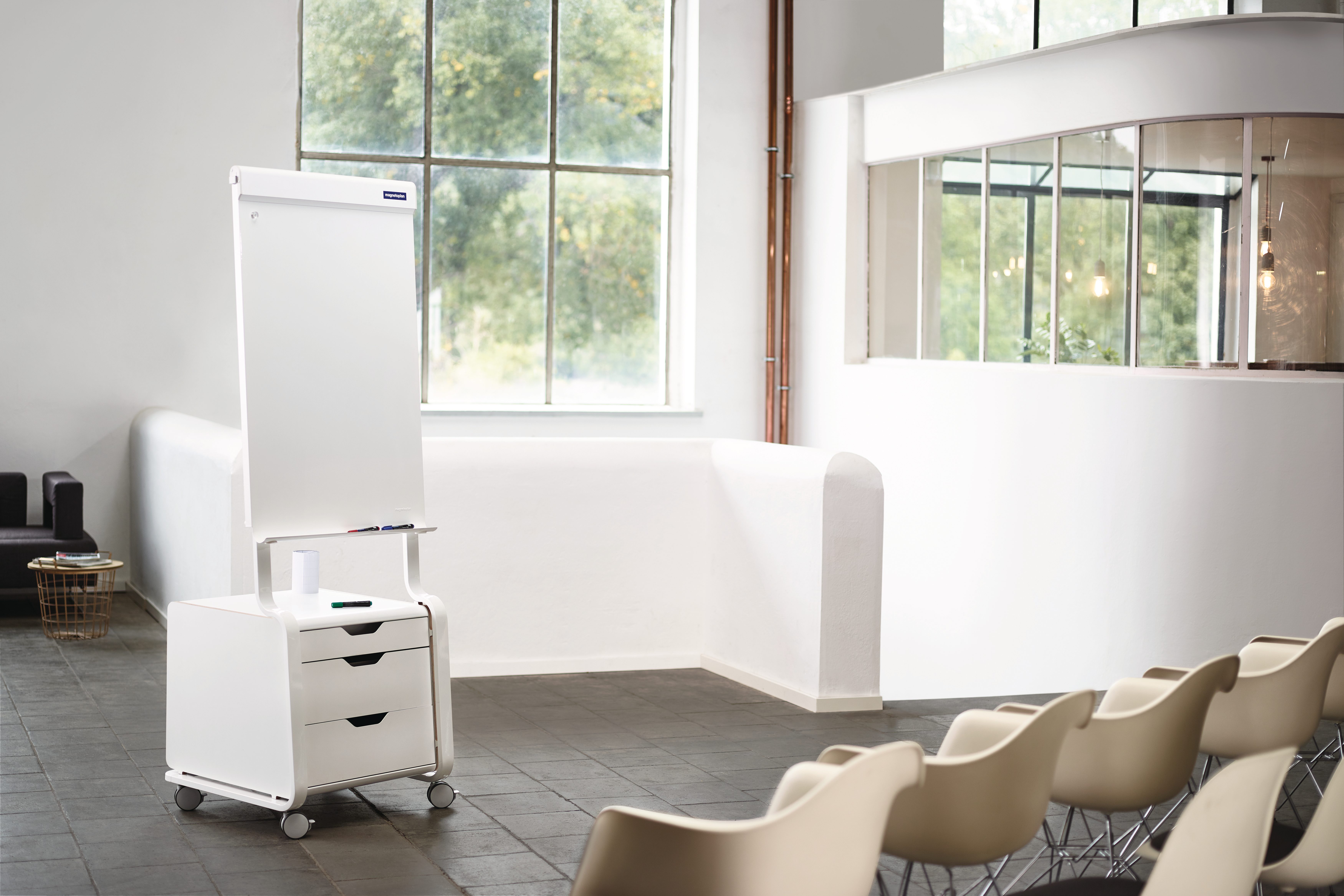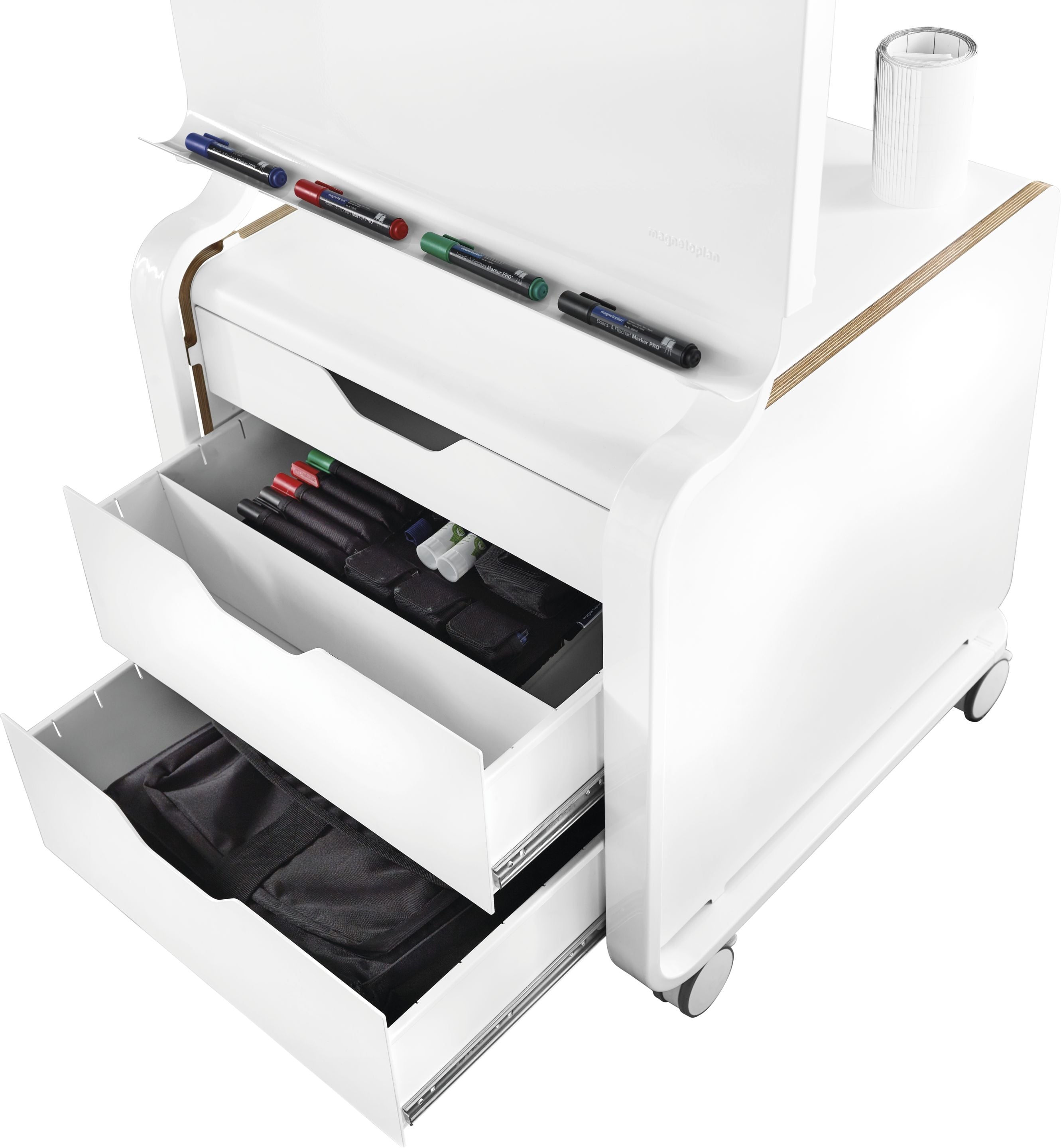 - Ein integrierter Zylinder (Ø 9 cm) bietet gerolltem Flipchart-Papier einen festen Platz und vollendet die hohe Funktionalität des Design-Möbels