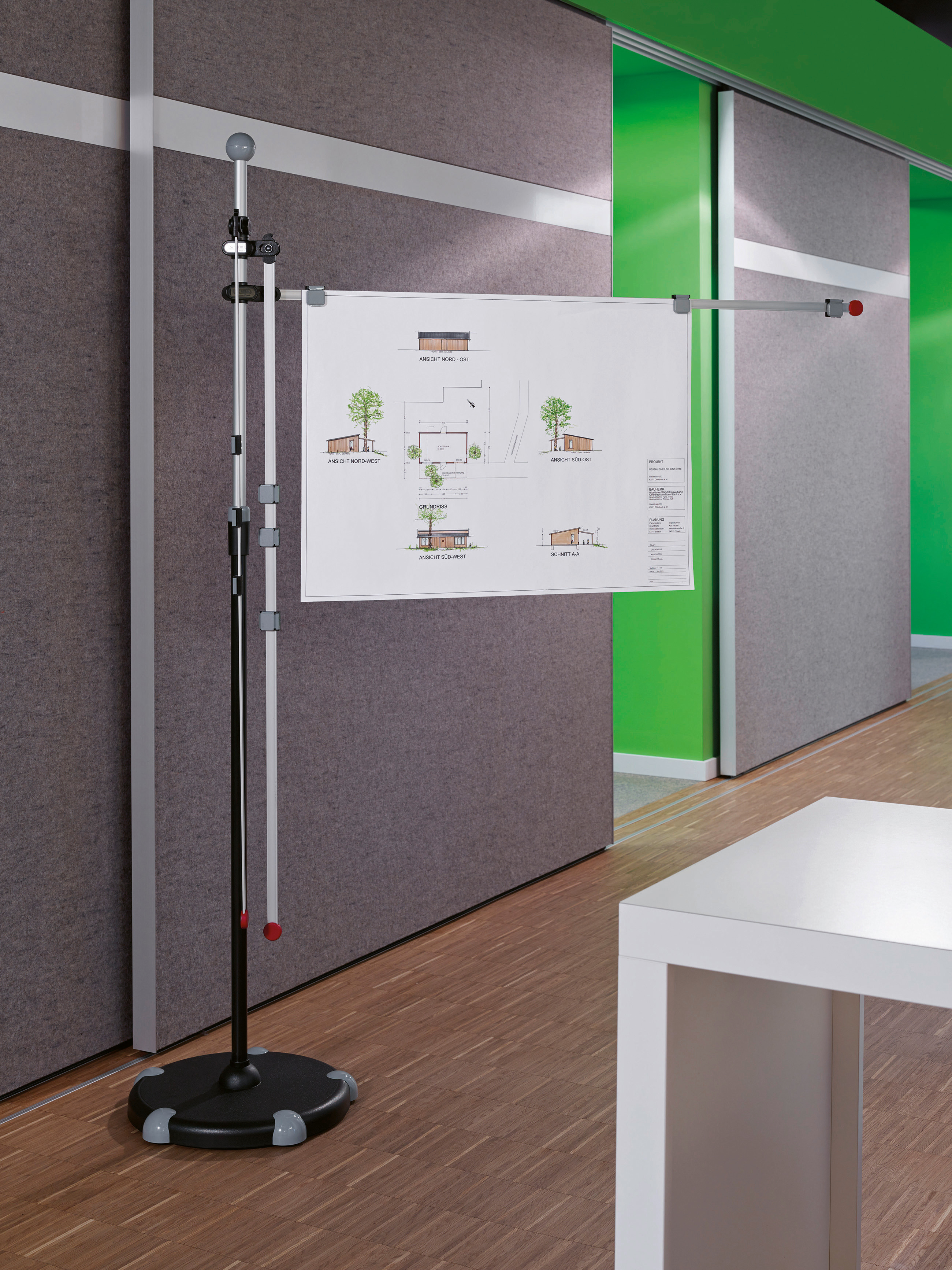 Hochfunktioneller mobiler Planhalter mit attraktivem Design. Zur Präsentation von Info-Vorlagen wie Plakate, Poster, Druckfahnen, technische Zeichnungen oder Flipchart-Blätter. Geeignet für Papier und andere Materialien, z.B. Stoffe oder Folien. Schwenkarme zum beidseitigen Anhängen der Vorlagen an verschiebbaren Magnetclips. Die Vorlagen werden einfach eingeschoben und "schnappen" fest - so können auch grosse Vorlagen von nur einer Person aufgehängt werden. Bei Nichtverwenden können die Arme Platz sparend eingeklappt werden. Eleganter Rollenfuss mit 5 integrierten Spezialrollen, standsicher und besonders flach.