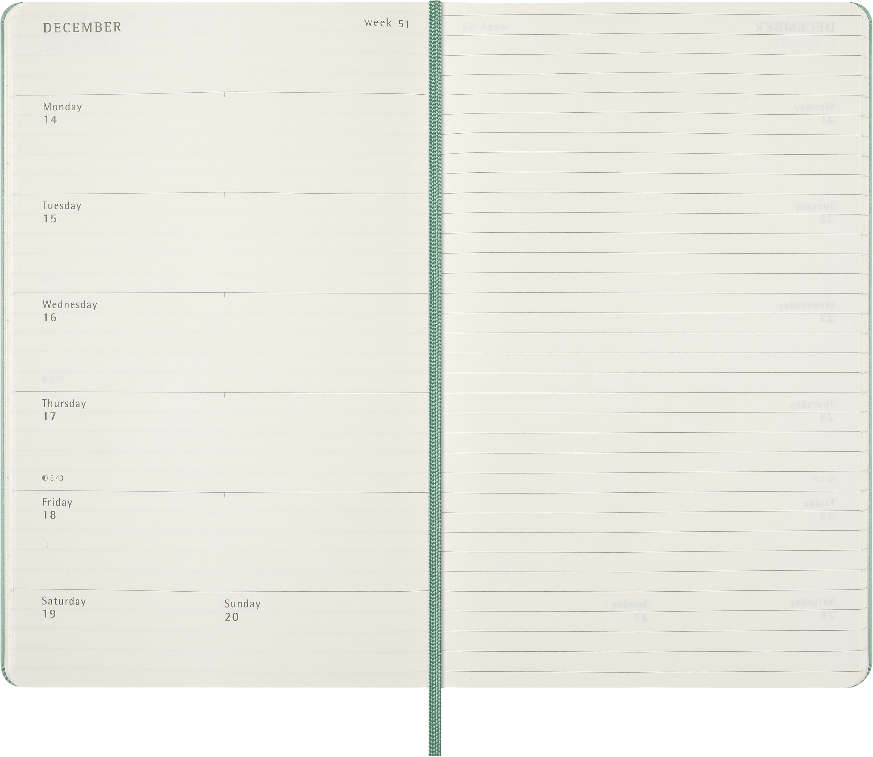 Der 18-Monate Wochen-Notizkalender von Moleskine geht von Juli bis Dezember. Mit den Wochenterminen auf der linken Seite und einer linierten rechten Seite mit Platz für Notizen und Ideen ist dieser beliebte Kalendertyp perfekt für Studenten, Lehrer und Geschäftsleute.