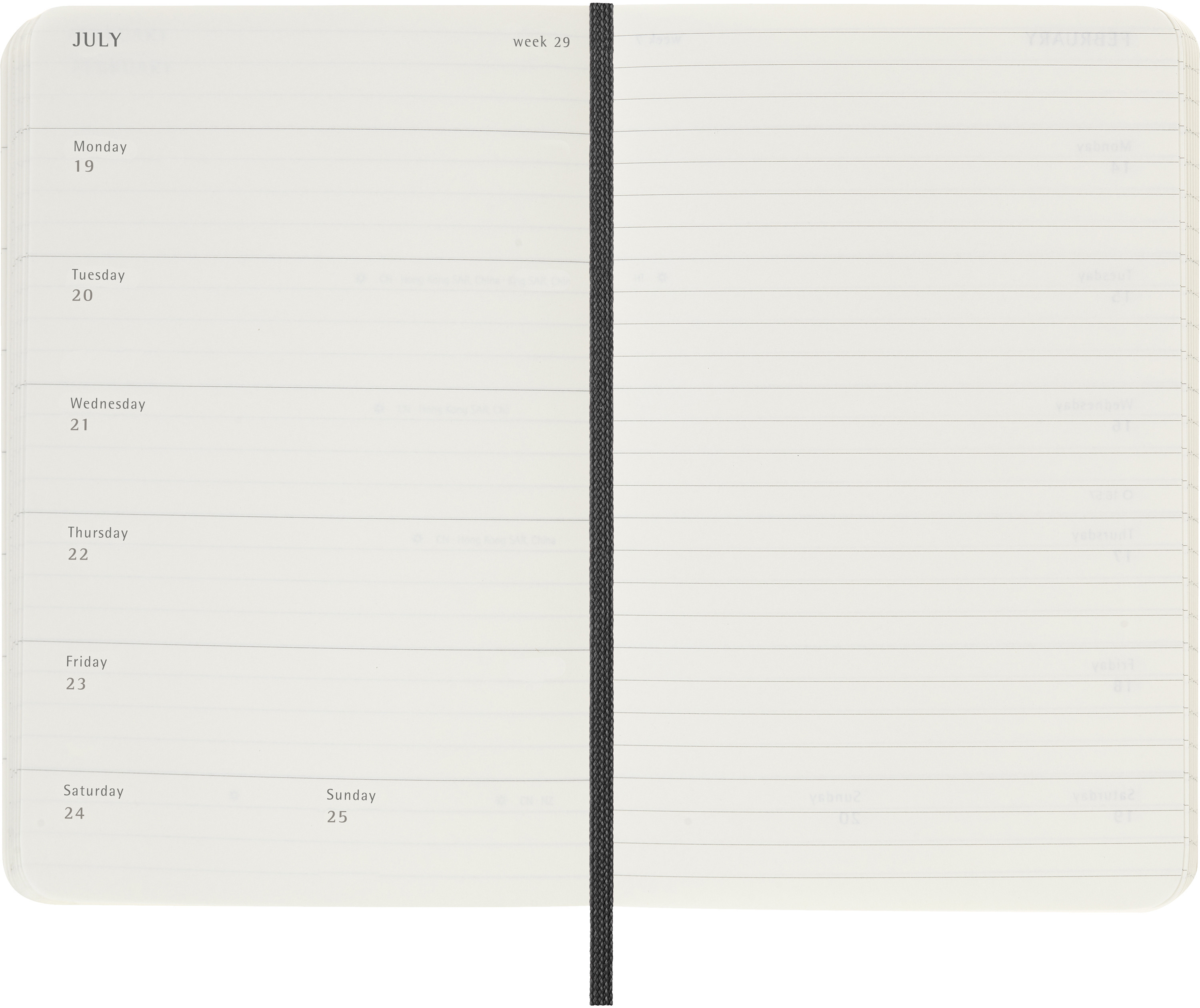 Der 18-Monate Wochen-Notizkalender von Moleskine geht von Juli bis Dezember. Mit den Wochenterminen auf der linken Seite und einer linierten rechten Seite mit Platz für Notizen und Ideen ist dieser beliebte Kalendertyp perfekt für Studenten, Lehrer und Geschäftsleute.