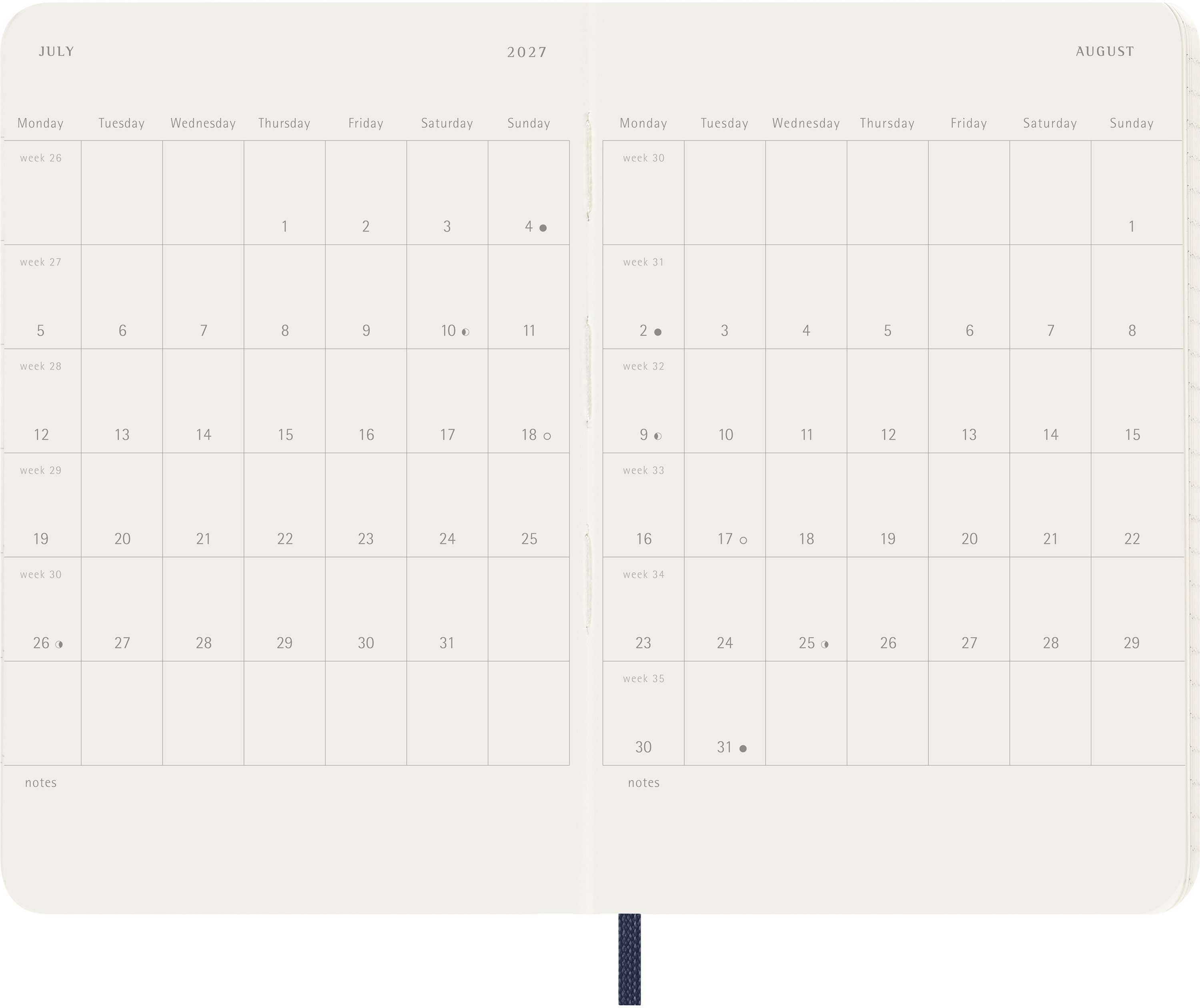 Der 18-Monate Wochen-Notizkalender von Moleskine geht von Juli bis Dezember. Mit den Wochenterminen auf der linken Seite und einer linierten rechten Seite mit Platz für Notizen und Ideen ist dieser beliebte Kalendertyp perfekt für Studenten, Lehrer und Geschäftsleute.