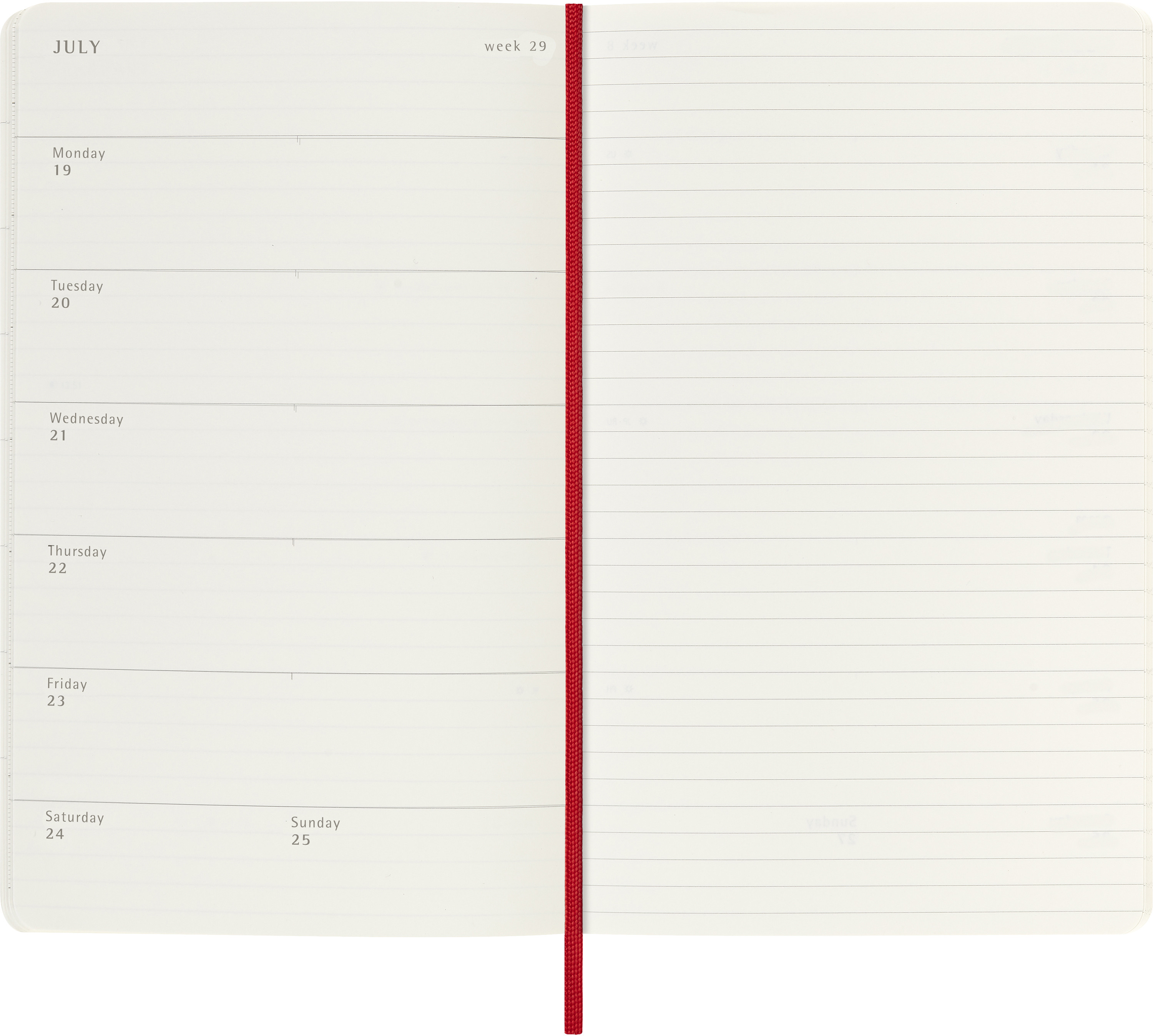 Der 18-Monate Wochen-Notizkalender von Moleskine geht von Juli bis Dezember. Mit den Wochenterminen auf der linken Seite und einer linierten rechten Seite mit Platz für Notizen und Ideen ist dieser beliebte Kalendertyp perfekt für Studenten, Lehrer und Geschäftsleute.