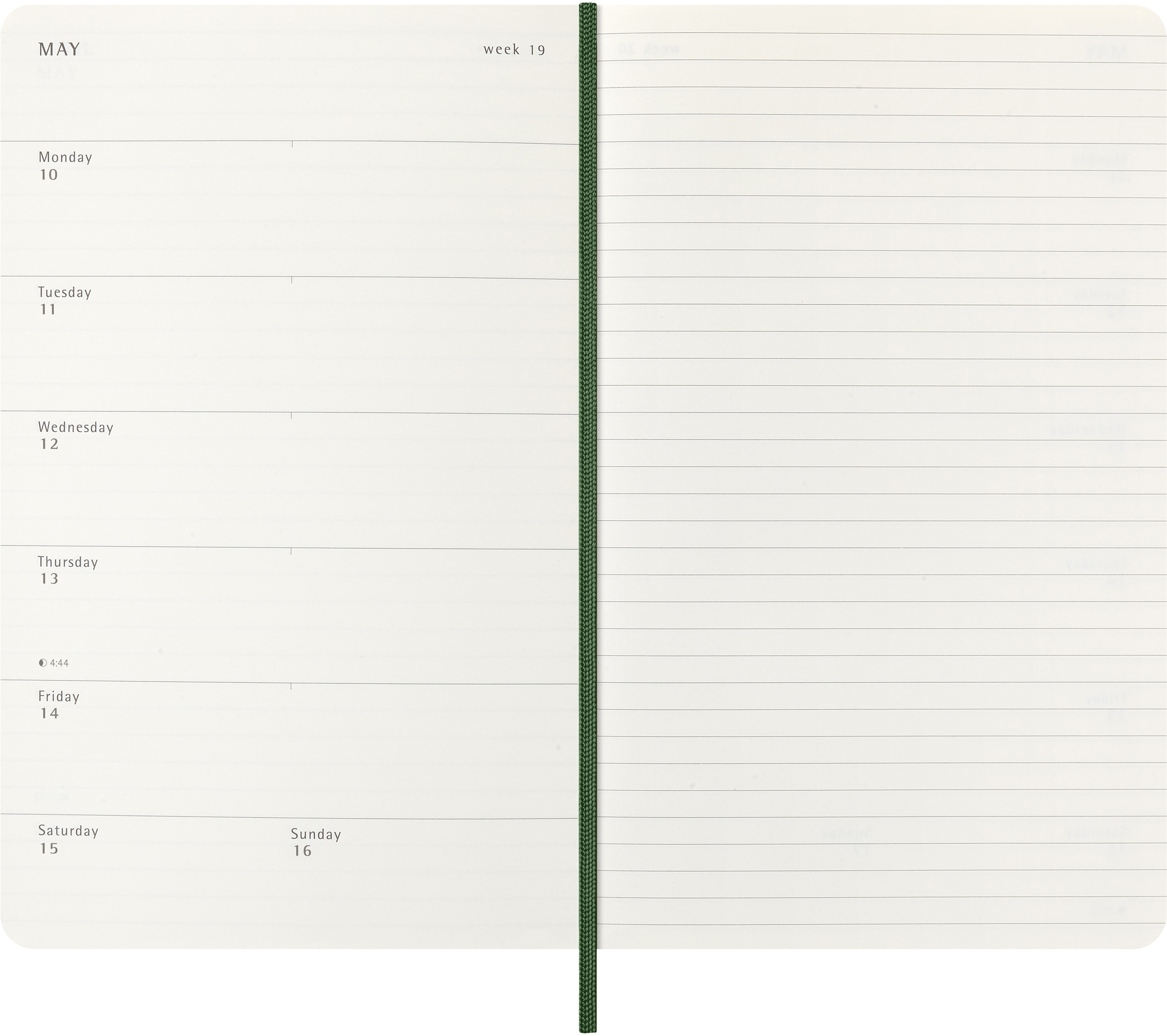 Der 18-Monate Wochen-Notizkalender von Moleskine geht von Juli bis Dezember. Mit den Wochenterminen auf der linken Seite und einer linierten rechten Seite mit Platz für Notizen und Ideen ist dieser beliebte Kalendertyp perfekt für Studenten, Lehrer und Geschäftsleute.