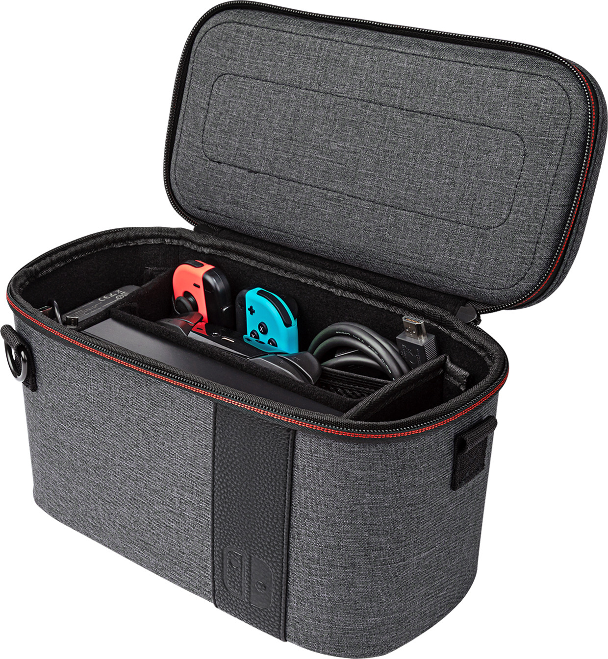 Die Struktur dieses Cases ist einzigartig auf dem Markt, mit halbstarrem 2-in-1-Design, texturiertem und detailliertem Kunstleder und roten Reissverschlüssen. Erfüllt alle Transportanforderungen. Für die Nintendo Switch-Konsole, Controller, Netzteil, Powerbank, ein Paar zusätzlicher Joy-Cons, 15 Spiele, Switch-Dock, HDMI-Kabel und sonstiges kleines Zubehör – alles, was du benötigst und noch mehr. Die austauschbaren Trennwände für Zubehör ermöglichen eine individuelle Stauraumkonfiguration im Case. Und wenn du einfach nur deine Konsole mit den Spielen und einigen Zubehörteilen mitnehmen möchtest, musst du lediglich das Deluxe Case oben auf dem Rucksack abnehmen und das Wesentliche mitnehmen. Unter offizieller Lizenz von Nintendo Switch.