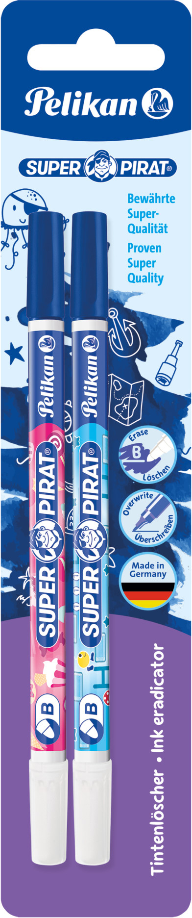 SUPER-PIRAT - der piratenstarke Tintenlöscher! Schreibfehler und Tintenflecken können ganz easy entfernt werden. Mit der weissen Löschspitze wird der Fehler oder Fleck mühelos unsichtbar gemacht. Ausgebessert wird dann mit der blauen Überschreibspitze – fertig!