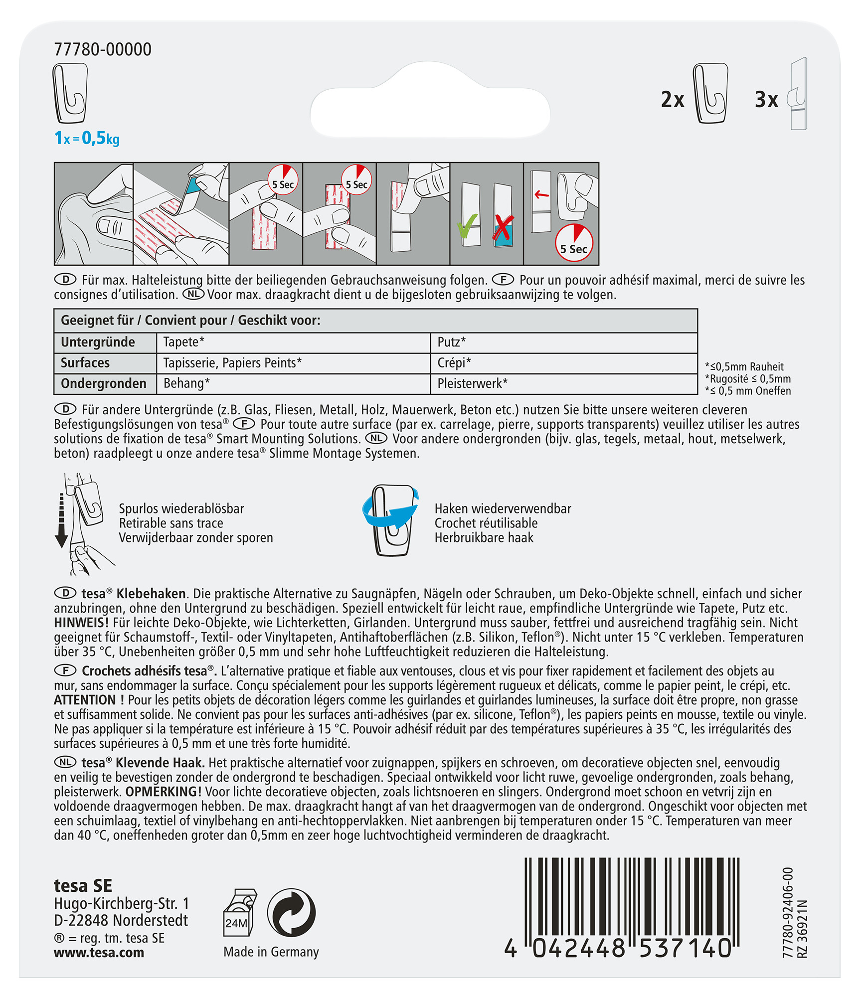 Produktinformationen "TESA Klebehaken 2x0,5kg 77780-00000 Tapete & Putz"