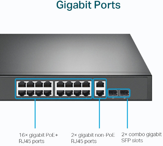 - 16× gigabit PoE+ RJ45 ports, 2× gigabit non-PoE RJ45 ports, and 2× combo gigabit SFP slots