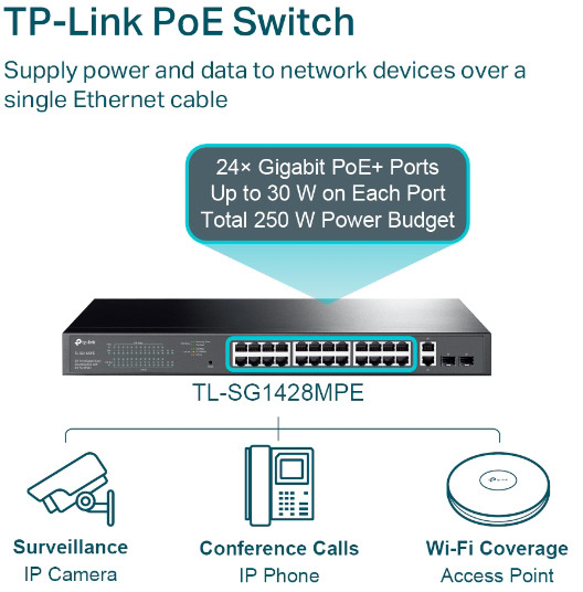 Der TL-SG1428PE ist vollständig mit PoE-Geräten, wie IP-Kameras, Accesspoints und IP-Telefonen kompatibel. Auch nicht-PoE-Geräte wie Computer, Drucker und IPTVs werden mit Gigabit-Verbindungen versorgt. Durch die Konformität mit dem 802.3af/at PoE+-Standard unterstützt der Switch bis zu 30W an jedem PoE-Port. Das PoE-Leistungsbudget* von insgesamt 250W für die 24× Gigabit-PoE+-Ports ermöglicht zahlreiche Einsatzmöglichkeiten, z. B. zur Überwachung, in Büros, Wohnheimen und kleinen Unternehmen. Er ist voll kompatibel mit IP-Kameras, Access Points, IP-Telefonen, Computern, Druckern usw.