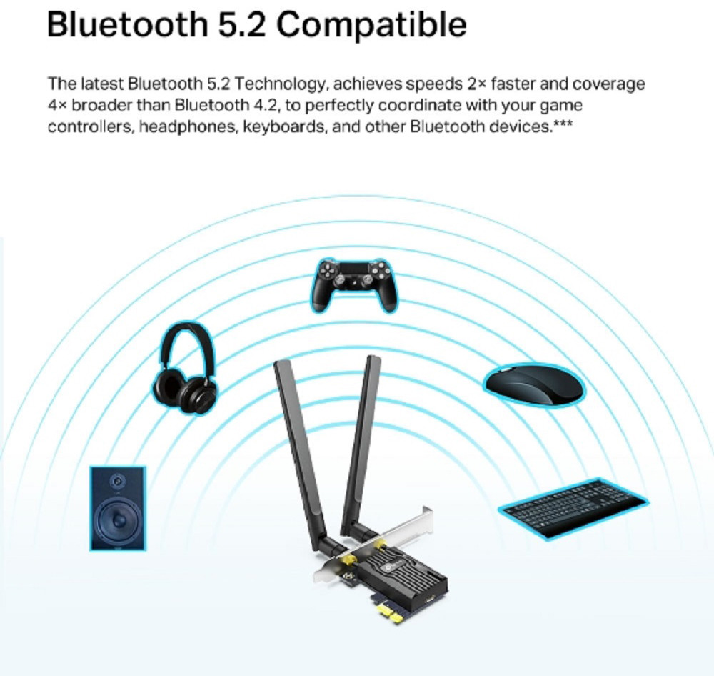 Der neueste Wi-Fi 6-Standard garantiert extreme Geschwindigkeiten, extrem niedrige Latenzzeiten und ununterbrochene Verbindungen. Der Archer TX20E rüstet Ihren PC mit Wi-Fi 6 aus und gewährleistet leistungsstarken, kontinuierlichen Signalempfang und schöpft so das volle Potenzial Ihres Wi-Fi 6-Routers aus. Der Archer TX20E stattet Ihren PC mit der fortschrittlichen Bluetooth 5.2-Technologie aus, die im Vergleich zu älteren Versionen schnellere Verbindungsgeschwindigkeiten und eine grössere Reichweite ermöglicht, gewährleistet eine starke und stabile drahtlose Verbindung zwischen Ihrem PC und Bluetooth Geräten.