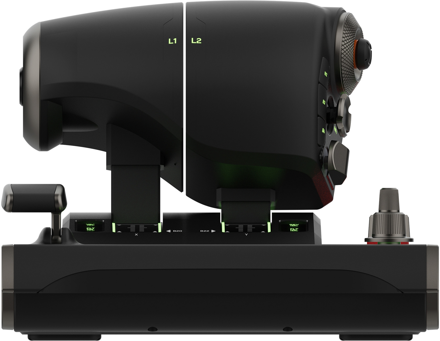 Hochwertiges HOTAS-System, 139 programmierbaren Funktionen sorgt dafür, dass du mitten im Geschehen bist und deine Hände am Steuer hast. Das Touch-Display für Flugsimulationen und das OLED-Head-Up-Display bieten ein noch nie dagewesenes Mass an Leistungsoptimierung und Produktanpassung. Und die Flight Hangar-App für den Desktop ermöglicht eine noch tiefgreifendere Anpassung, einschliesslich RGB-Beleuchtungszonen. Umfassende Gashebelsteuerungen. Mit umfassenden Bedienelementen auf Knopfdruck. Zwei Gashebel mit integrierter Verriegelung ermöglichen maximale Flexibilität, egal ob du ein einmotoriges oder mehrmotoriges Fluggerät steuern willst. Die ultrasanfte Gassteuerung wird durch haptische Rasten verbessert, die über das Dashboard zum Touch-Display für Flugsimulationen vollständig einstellbar sind. Auf der Rückseite des Gashebels befinden sich Kippschalter, um feindliches Radar oder GPS zu blockieren, sowie ein Scrollrad, eine Auswahltaste und ein umschaltbares 4-Wege-Navigationspad. Der Daumenbereich umfasst einen 8-Wege-HAT-Schalter auf der rechten Seite des Gashebels, der ein schnelles Umschalten zwischen den Angriffsmodi ermöglicht, ein Daumenrad zur Steuerung des Zooms, eine analoge POV-Taste zur Steuerung der Radar-Cursorbewegung sowie einen Schiebeschalter für die Luftbremse. Drei umschaltbare Tasten sind vollständig anpassbar, um noch mehr Systeme zu steuern. Mit der FIRE-Drucktaste oben rechts auf dem Gashebelmodul kannst du schnell Triebwerksbrände löschen oder die Waffensteuerung umstellen. Direkt unter der FIRE-Drucktaste befinden sich drei Drehregler für einfache Autopilot-Anpassungen, und alle drei Drehregler und Tastendrucke können nach Belieben umprogrammiert werden. Die Flugkonfiguration des Flugzeugs lässt sich mit dem Klappenhebel in der linken unteren Ecke des Gashebelmoduls leicht ändern, wobei zwei Rasten an jedem Ende des Hebels das Ein- und Ausfahren der Klappen ermöglichen.