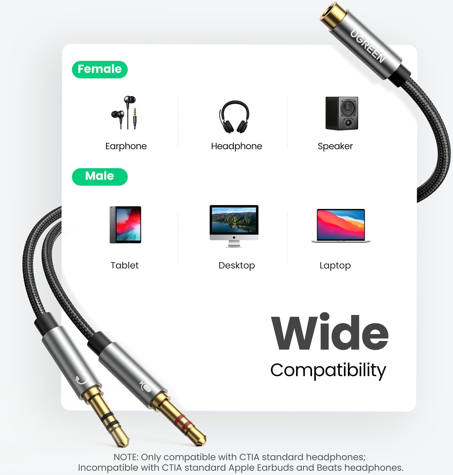 Mit dem Ugreen Kopfhörer-Splitter können Sie Kopfhörer mit integriertem Mikrofon und einem einzelnen 3,5-mm-Miniklinkenstecker an zwei 3,5-mm-Miniklinkenanschlüsse anschliessen (Kopfhörer und Mikrofon getrennt). Beide Stecker wurden intuitiv mit den Symbolen von Mikrofon und Kopfhörer beschriftet, damit jeder schnell die Geräte anschliessen kann. Mit seiner Hilfe können Sie bequem sprechen und Musik hören. Bietet eine hohe Klangqualität. Es wurde aus grossartigen Materialien hergestellt, die gegen geringfügige mechanische Beschädigungen beständig sind. Brüche oder Abschürfungen sind für ihn nicht schlimm. Verstärkte Stecker verhindern, dass das Kabel an empfindlichen Stellen bricht.