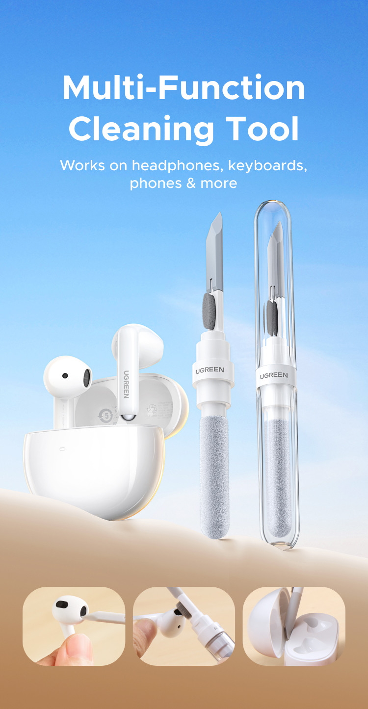 Der UGREEN Ohrhörerreiniger ist ein kompaktes 3-in-1-Reinigungswerkzeug, das Ohrhörer, Kopfhörer und deren Ladecases hygienisch sauber hält. Sein stiftförmiges Gehäuse beherbergt drei spezielle Reinigungskomponenten: eine feine Silikonspitze zum Entfernen von Schmutz aus kleinen Spalten und Lautsprechergittern, eine weiche Mikrofaserbürste zum Entfernen von Staub und Ohrenschmalz sowie einen beflockten Schwamm, der das Innere von Ladecases schonend und kratzfrei reinigt. Hergestellt aus robustem ABS und PC, ist der Reiniger leicht und handlich und somit ideal für den täglichen Gebrauch oder auf Reisen. Dank seines vielseitigen Designs eignet er sich auch zur Reinigung anderer kleiner elektronischer Geräte wie Smartphone-Anschlüsse, Tastaturen und Kamerakomponenten und bietet so eine sichere und effiziente Möglichkeit zur Pflege empfindlicher Technik-Accessoires.